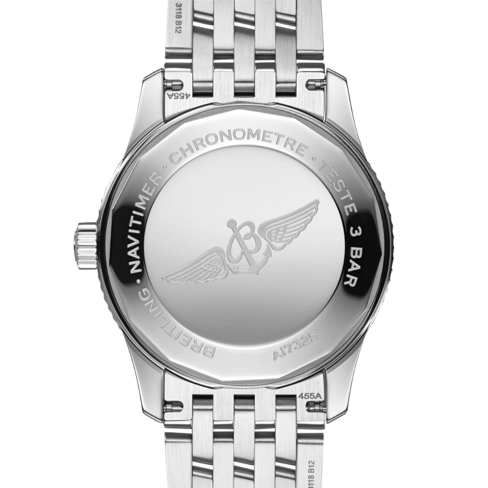 True to its aviation roots, the bidirectional bezel incorporates the iconic slide rule, a hallmark feature of the Navitimer collection used by pilots to perform crucial calculations during flight.