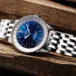 With a polished stainless steel case, striking blue dial framed by a silver outer ring, and luminous hands, this COSC-certified chronometer offers a seamless blend of heritage and modern design. The signature slide rule bezel and date window at 6 o’clock add practical functionality, while the stainless steel bracelet ensures durability and comfort.