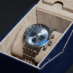The striking blue dial features refined baton indexes and three polished chronograph counters that honor the original Navitimer layout. At the 12 o’clock position, the AOPA wings pay tribute to its aviation roots, reflecting its status as the official watch of the Aircraft Owners and Pilots Association in the 1950s.