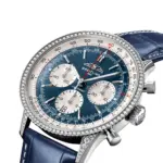 Paired with an elegant blue alligator leather strap, the Navitimer retains a sense of stately comfort while on the wrist. Its ergonomic thickness of 13.6 mm and water resistance of 30 meters further reinforce its suitability as both a statement piece and everyday companion.