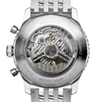 Crafted from stainless steel, the 46 mm case presents a blend of brushed and polished surfaces for visual depth. The signature notched bidirectional bezel houses the iconic slide rule function, a staple for aviation calculations. The screw-down sapphire caseback offers a captivating view of the Breitling 01 movement in action.