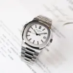The Patek Philippe Nautilus 5711/1A-011 is a rare and highly sought-after luxury sports watch, celebrated for its clean, minimalist design and timeless elegance. This 2017 edition features a 40mm stainless steel case with a classic silvery white dial, setting it apart from the more common blue-dial version.